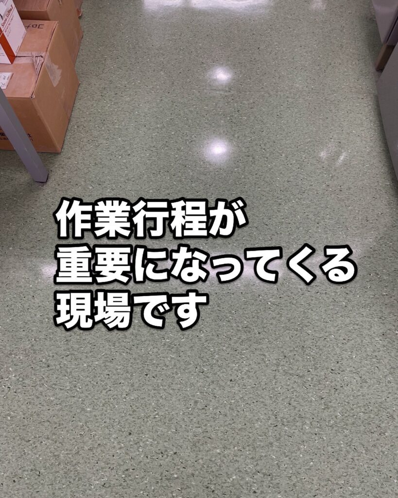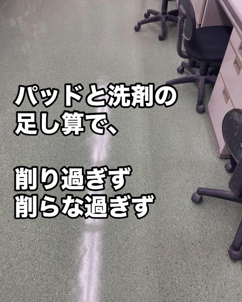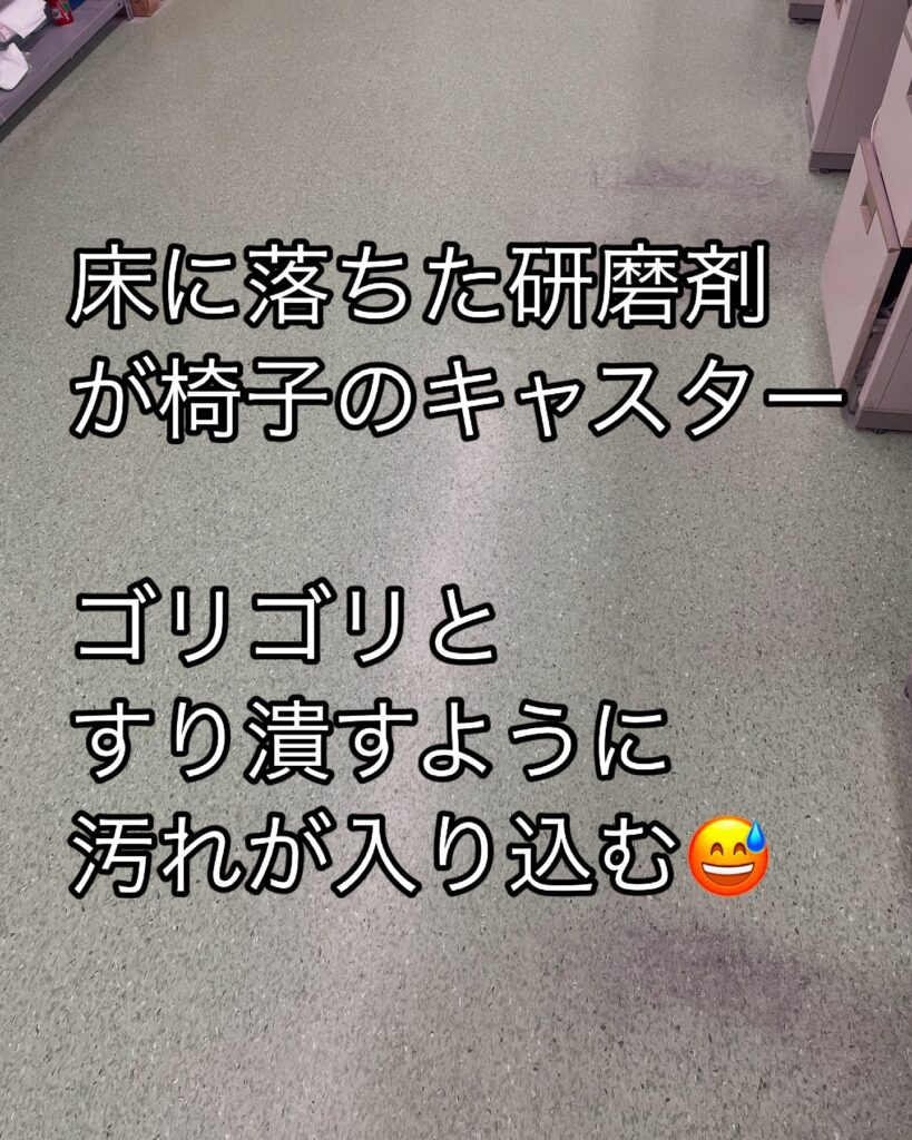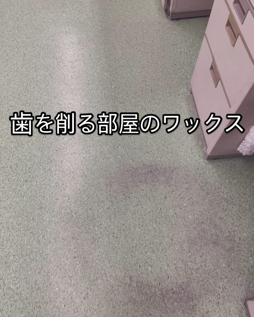 年2回の定期清掃の現場になります。お客様の型取りの銀歯などを削る部屋なので、常に削り粉が散乱しています。床に落ちた削り粉を、椅子のキャスターで踏んでしまい、そのまま押したり引いたりとするので、傷がつきます。その傷の中に削り粉が入り込み、更に傷を拡大。